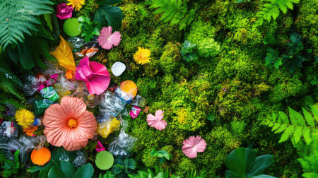 This vibrant image showcases colorful flowers entwined with plastic waste against a lush green backdrop, emphasizing environmental concerns and sustainability.