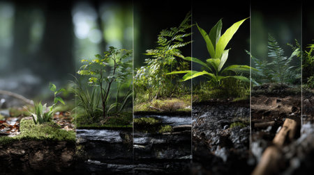 Explore a stunning visual collage showcasing the beauty of diverse ecosystems, featuring textures of frost, blooming flowers, and vibrant underwater coral life.