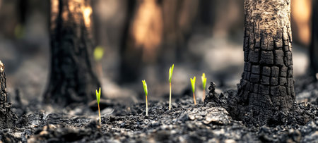 Fresh green sprouts appear among blackened trees, symbolizing resilience after a wildfire