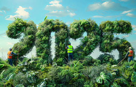 Outdoor greening scene workers in fluorescent green vests amidst grass covering 2025 illustration