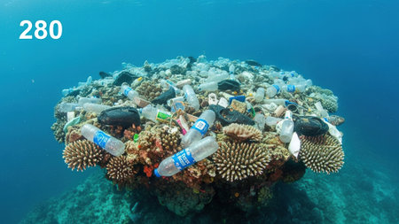 Plastic waste on a tropical coral reef in the Red Sea.