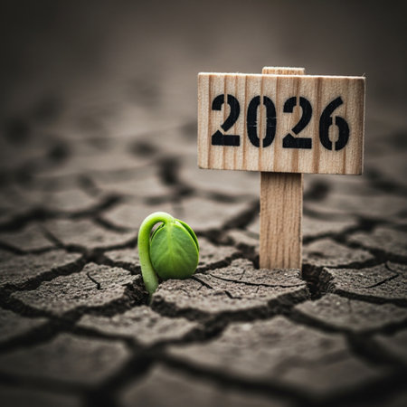 A close-up captures vibrant green sprouts emerging from cracked, dry soil. The image showcases textural details of the earth, contrasting with the fresh, youthful leaves. Sunlight bathes the scene, highlighting the resilience of life in a barren environment. Suitable for illustrations on growth, sustainability, or environmental themes.
