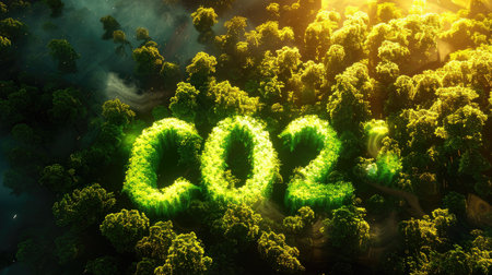 The image features an illustration of CO2, with visual elements of nature in the background. The composition uses a green and blue color scheme, with hints of graphic design. This image could be used for editorials on environmental topics, climate change discussions, or presentations on sustainability. It avoids any mention of specific locations or brands.