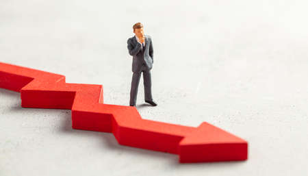 Figurine of a businessman in a suit and tie and a red down arrow. The concept of bankruptcy, falling profits and reducing indicators, analysis of losses