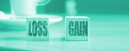 Wooden blocks on wooden table with Loss and Gain words. Money finance assets credit debt profitability loss and gain business concept.