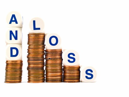 Letter Dice Spelling Profit and Loss atop Penny Stacks