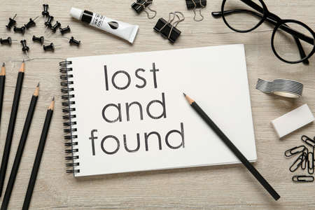Flat lay composition of sketchbook with phrase Lost and Found on wooden table