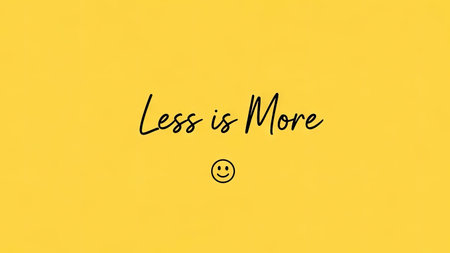 A yellow background features the phrase Less is More in a handwritten style, accompanied by a small smiling face symbol. The composition has a clean, simple aesthetic with black text, suitable for various editorial and commercial applications, including marketing and design projects.