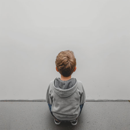 little boy sitting on the floor and looking at the gray wall.