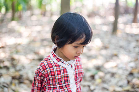 Sad little girl standing in outdoor. Low angle view.