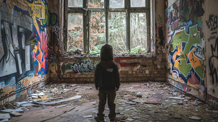 Child in hoodie contemplates graffiti-covered walls and broken windows in a desolate abandoned building.