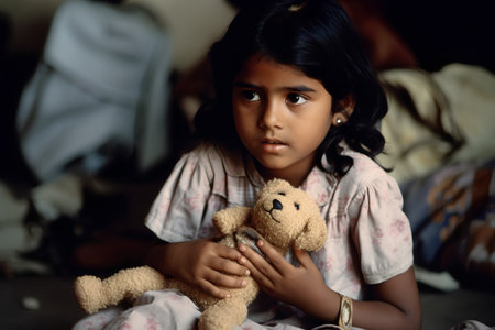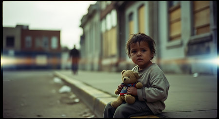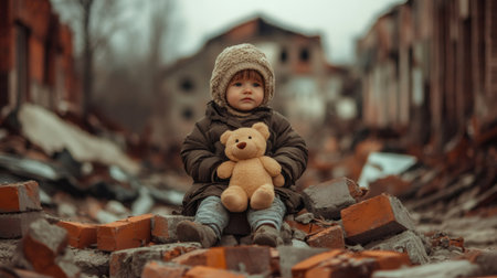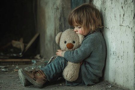A young child sits against a worn wall in an abandoned area, holding a soft teddy bear tightly.