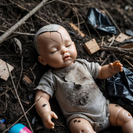A cracked doll lies abandoned in the dirt, surrounded by broken twigs and debris. Its fractured surface and closed eyes evoke deep associations with trauma, war, and the silent suffering of forgotten childhoods. The image becomes a haunting symbol of innocence lost in disaster zones, whether shaped by conflict, earthquakes, or neglect.