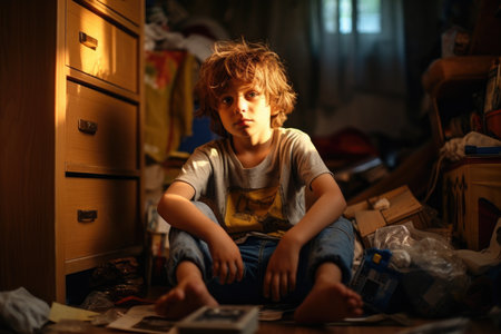 Sad child sitting on the floor in his messy room full of toys, feeling lonely and abandoned