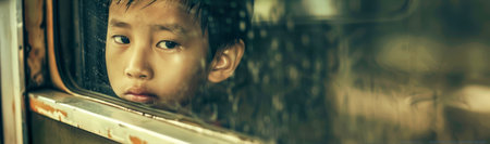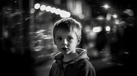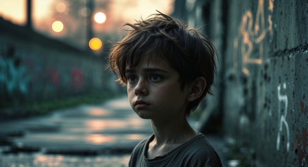 AI Generated. Young Boy Gazing Thoughtfully in a Dimly Lit Urban Environment During Twilight With Hints of Evening Lights in the Background
