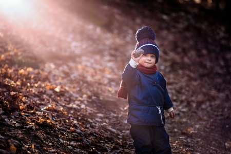 Caucasian boy playing outdoor at springtime. Boy holding stone in his hand