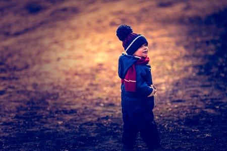 Portrait of a cute little boy on the street at night.