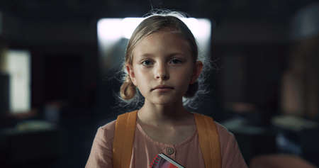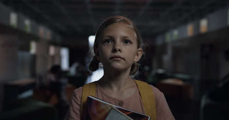 Portrait of tensed little girl walking lively hallway holding books. Focused blonde child going dark corridor on school break alone looking ahead. Stressed frightened pupil worrying about first day.