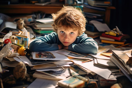 A young boy sits in a lot of books and notebooks