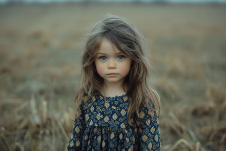 Portrait of a cute little girl with long curly hair in a wheat field