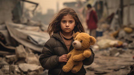 A sad girl holding a teddy bear in front of collapse buildings area, natural disaster or war victim, Palestinian.