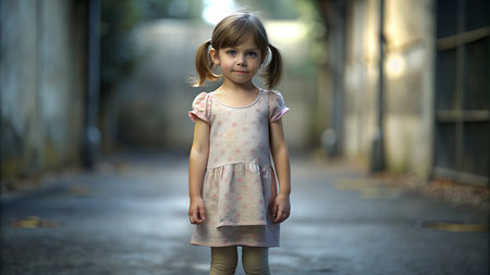 Young girl standing alone in a narrow alley