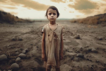 A young girl with a solemn expression stands in a slum, surrounded by makeshift homes and debris, embodying the struggles of poverty in an urban landscape.