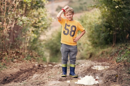 Tricky face boy near the puddle on country road