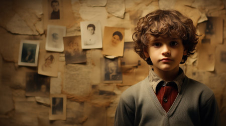A young boy in a sweater and tie standing next to wall of pictures, AI