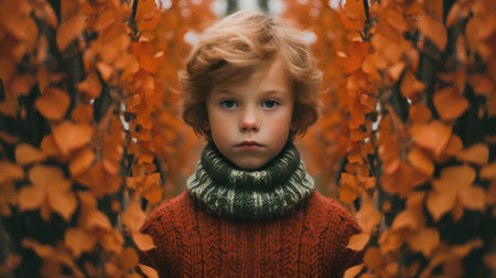 A young boy standing in a natural outdoor setting surrounded by autumn foliage with a thoughtful introspective expression as he gazes downwards
