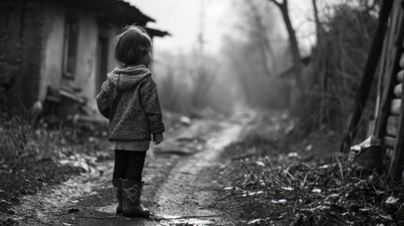 Little girl walking in the village. Black and white photo with shallow depth of field