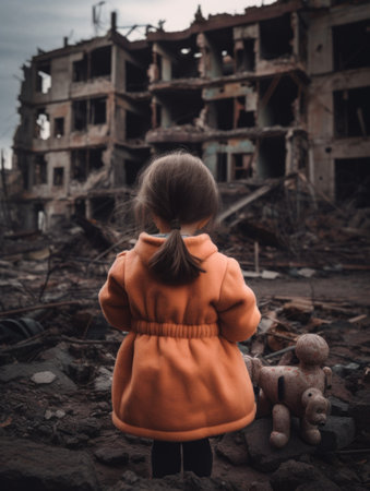 Little girl looks at war-torn buildings and houses. AI generative.