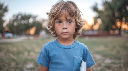 A young boy looks up with a curious expression, surrounded by nature, captured in soft, warm lighting with dreamy tones.
