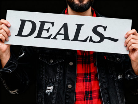 Close-up of a man holding a white rectangular sign with bold black text DEALS. The man is dressed in a red plaid shirt and black denim jacket, standing against a dark background.