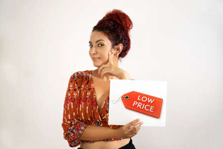 Girl with mischievous face and one hand on her face holding a low price sign with her other hand. Young woman with white skin and curly red hair dressed in colorful patterned clothing