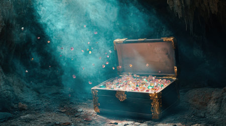 A captivating treasure chest lies open in a dark cave, revealing a bounty of sparkling jewels. Dusty light rays create a mystical atmosphere, enhancing exploration wonder.