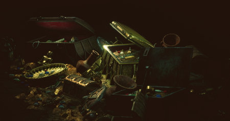 A collection of ancient treasures lies scattered in a dimly lit space, highlighting ornate boxes and sparkling jewels. The atmosphere evokes a sense of mystery and adventure, inviting exploration.