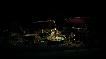 In a darkened setting, ornate treasure chests lie open, overflowing with gold coins, jewels, and intricate artifacts, inviting exploration and igniting the imagination of adventurers.