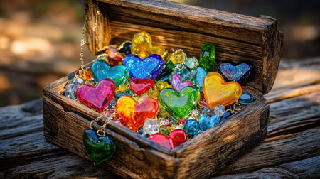 A vivid arrangement of heart-shaped colorful gems in a rustic wooden box, illuminated by soft natural light, creating a cheerful and artistic display.