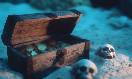 In a shadowy underwater scene, treasure chests overflow with gold coins and jewels. Ancient artifacts lay scattered among dark rocks, hinting at once glorious shipwrecks beneath the waves.
