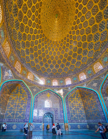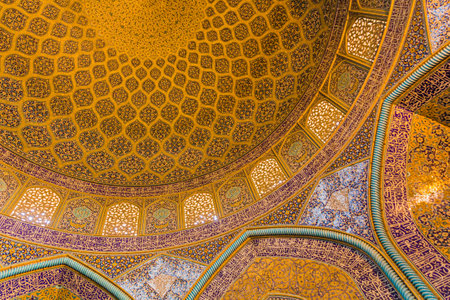 ESFAHAN, IRAN - 20 OCTOBER 2018: Beautifully decorated interior Sheikh Lotfollah Mosque is one of the architectural masterpieces of Iranian, standing on the eastern side of Naghsh-i Jahan Square