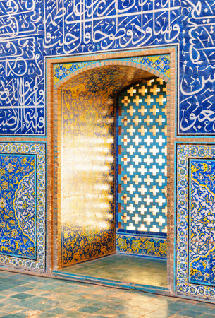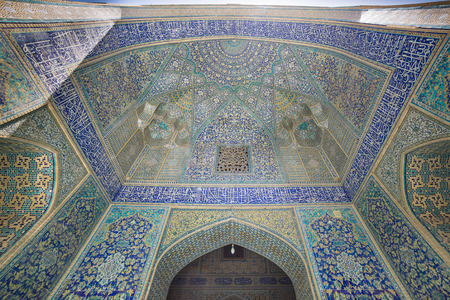 ISFAHAN, IRAN - OCTOBER 21, 2017: The richly decorated half-moon recessed gateway of historic Sheikh Lotfollah mosque is covered with ornate Persian tiling, on October 21 in Isfahan.