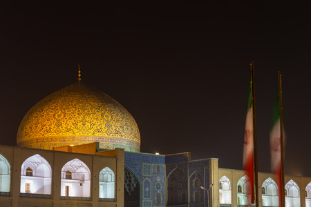 Iranian flags and Sheik Lotfollah Mosque at the Naqsh-e Jahan square, Isfahan, Iran. The mosque is one of the architectural masterpieces of Safavid iranian architecture. The costraction started in 1603 and was finished in 1619.