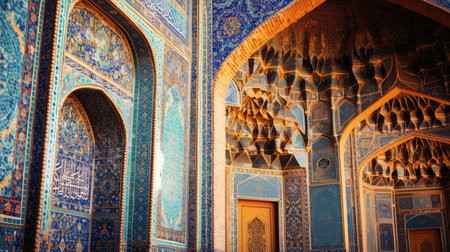 Stunning interior of an ancient Islamic architecture with arched doorways, intricate tilework, and reflective marble floors in rich blue tones