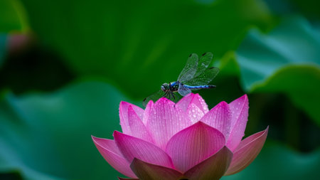 Blue dragonfly on pink lotus flower with water droplets, green blurred background.