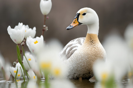 A beautiful goose spreads its wings gracefully in the early morning mist, creating a serene and tranquil scene. This captivating image captures the essence of wildlife in nature.