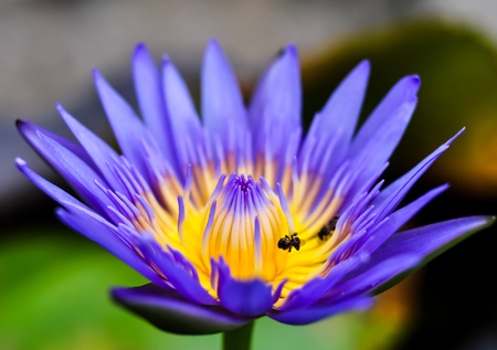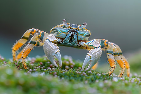 A colorful crab on a rocky surface with a blurred natural background. Ideal for themes of marine life, nature, and wildlife.