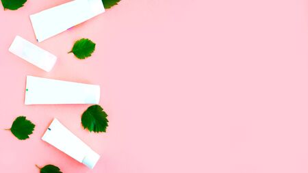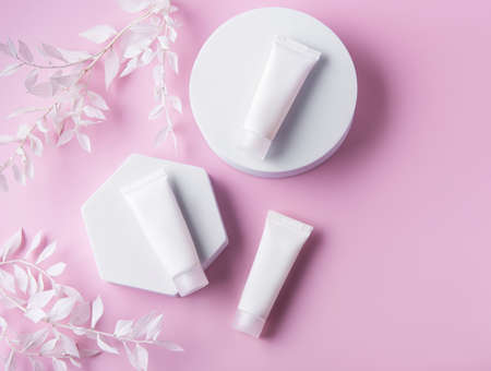 White squeeze tubes, bottles of moisturizing cream flat lay on pink and white