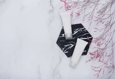 Unbranded white squeeze cosmetic cream bottle tube on marble background. Natural oranic spa cosmetics concept. Mockup, template, top view