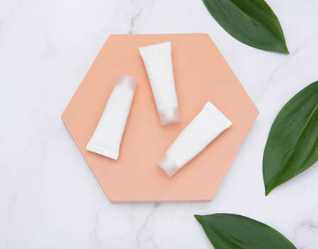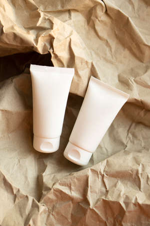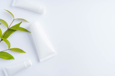 A set of cosmetic products in white tubes with empty space for labeling. Cosmetics for face and body skin care. Moisturizing cream, purifying mask.